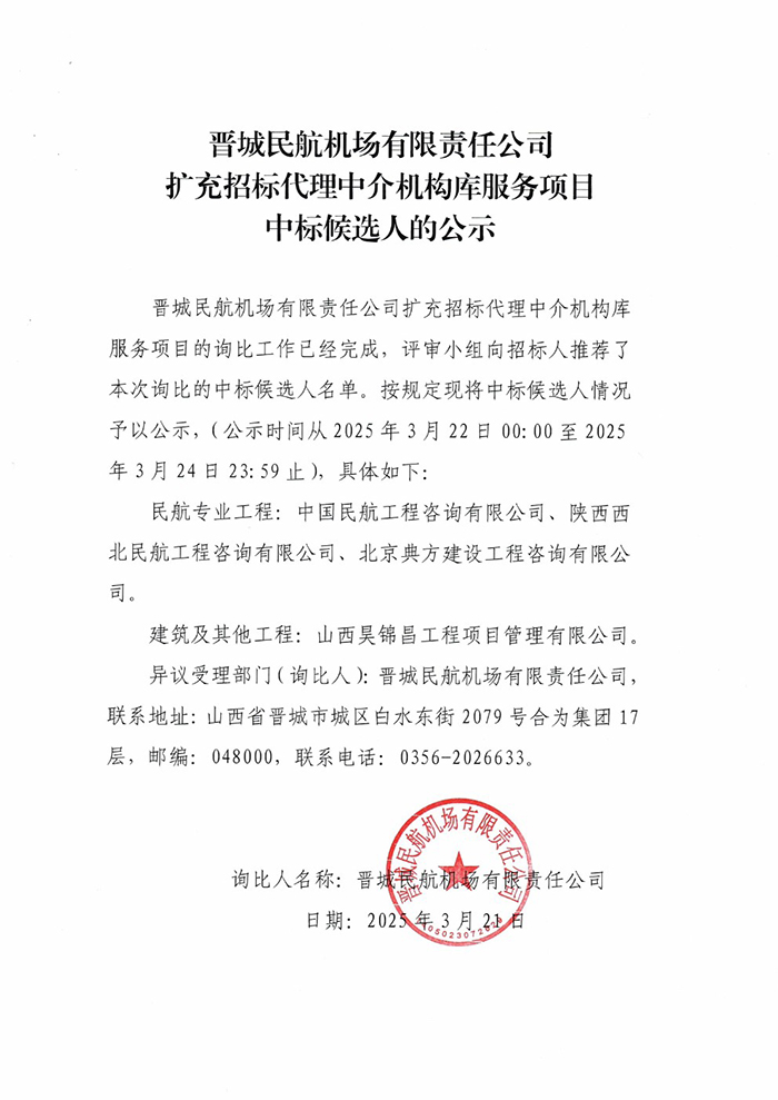 晉城民航機(jī)場(chǎng)有限責(zé)任公司擴(kuò)充招標(biāo)代理中介機(jī)構(gòu)庫(kù)服務(wù)項(xiàng)目中標(biāo)候選人的公示