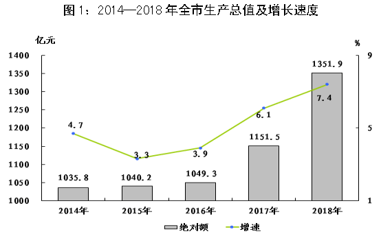 初步核算,全年全市生產(chǎn)總值1351.9億元,按可比價格計算,比上年增長7.4%。其中,第一產(chǎn)業(yè)增加值49.2億元,增長0.3%,占生產(chǎn)總值的比重為3.6%;第二產(chǎn)業(yè)增加值717.9億元,增長7.2%,占生產(chǎn)總值的比重為53.1%;第三產(chǎn)業(yè)增加值584.8億元,增長8.5%,占生產(chǎn)總值的比重為43.3%。第三產(chǎn)業(yè)中,金融保險業(yè)增加值86.8億元,增長8.0%;交通運輸、倉儲和郵政業(yè)增加值100.9億元,增長5.9%;批發(fā)和零售業(yè)增加值68.2億元,增長3.2%;住宿和餐飲業(yè)增加值37.5億元,增長6.7%;營利性服務(wù)業(yè)增加值82.6億元,增長23.8%。人均地區(qū)生產(chǎn)總值57819元,按2018年平均匯率計算為8737美元。