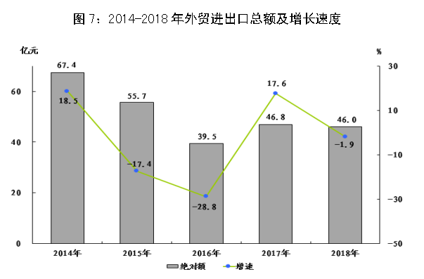 全年全市海關(guān)進出口總額46.0億元,下降1.9%。其中,進口額33.4億元,下降2.7%;出口額12.6億元,增長0.2%。