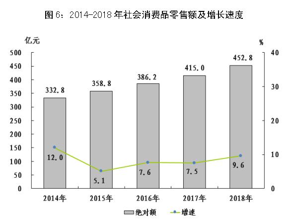 全年全市社會消費品零售總額452.8億元,增長9.6%。按經(jīng)營地統(tǒng)計,城鎮(zhèn)消費品零售額383.9億元,增長9.1%;鄉(xiāng)村消費品零售額68.9億元,增長12.4%。