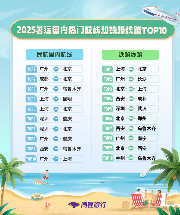 《報告》顯示,北京、成都、昆明、上海等在今年暑運民航國內(nèi)熱門目的地中排名靠前,廣州—北京、成都—北京、廣州—烏魯木齊等國內(nèi)航線熱度較高。暑運期間,鐵路出行熱度較高的線路主要有上!本、廣州—長沙、北京—上海、西安—成都等。暑運民航國內(nèi)航線親子客群占比預(yù)計約為35%,以親子游及親子跨城探親需求為主,北京、西安等位居暑期親子旅行熱門目的地前列。暑運期間,更具性價比的中轉(zhuǎn)聯(lián)程方案預(yù)計熱度較去年同期將進一步上升,北京、成都、昆明等位居熱門中轉(zhuǎn)城市前列。根據(jù)同程研究院測算,今年暑運期間民航首次乘飛機出行的旅客將達到約600萬,對樞紐機場首乘服務(wù)需求較大。